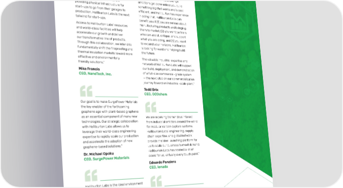 Halliburton 2021 Annual & Sustainability Report Environmental 49 What Our Participants Say [Halliburton is] not just providing None of anyone’s climate change curriculum and courses, they are ambitions get done unless you build providing physical infrastructure for something big that works and is cost start-ups to go from their garages to efficient, and Halliburton has experience production. Halliburton Labs is the next in doing that. Halliburton Labs can tailwind for start-ups. benefit you if (1) you are serious about Access to Halliburton Labs’ resources manufacturing products and bringing and world-class facilities will help them to market, (2) you want partners accelerate our growth and deliver who can assist, critique, and support our transformative line of products. what you are doing, and (3) you want Through this collaboration, we intend to to expand your horizons. Halliburton fundamentally shift the fireproofing and is looking forward and helping build thermal insulation markets toward more the future. effective and environmentally The valuable industrial expertise and friendly solutions.” network of Halliburton Labs will support Mike Francis our build, deployment, and demonstration CEO, NanoTech, Inc. of a full-size commercial-grade system — the next step on our commercialization journey toward an industrial-scale plant.” Todd Brix CEO, OCOchem Our goal is to make SurgePower Materials the key enabler of the forthcoming graphene age with plant-based graphene as an essential component of many new We are receiving tremendous interest technologies. Our strategic collaboration from industrial emitters around the world with Halliburton Labs allows us to for modular carbon capture systems. leverage their world-class engineering Halliburton Labs’ engineering, supply expertise to rapidly scale our production chain expertise, and global network and accelerate the adoption of new provide the ideal launching platform for graphene-based solutions.” us to scale our business to meet demand. Dr. Michael Opoku Halliburton Labs has opened a lot of CEO, SurgePower Materials doors for us, virtually every touch point.” Edoardo Panziera CEO, Ionada Halliburton Labs is the ideal environment to scale our cutting-edge lithium battery recycling technology. We are excited to We are honored to join Halliburton tap into Halliburton Labs’ engineering Labs. Their broad global network and and supply chain expertise and global deep manufacturing expertise will business network to accelerate assist Enexor in meeting its significant Momentum to the forefront. Participation worldwide demand while making a in Halliburton Labs has signaled to significantly positive environmental the market that we are an impact. This is a major step forward in established company.” our worldwide launch.” Preston Bryant Lee Jestings CEO, Momentum Technologies Founder and CEO, Enexor BioEnergy