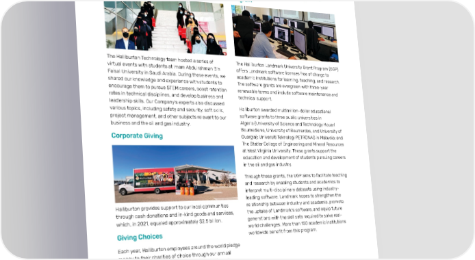 Halliburton 2021 Annual & Sustainability Report Social 71 Educational and Community Engagement (continued) Sharing STEM Knowledge with University Halliburton Landmark University Grant Students in Saudi Arabia Program The Halliburton Technology team hosted a series of The Halliburton Landmark University Grant Program (UGP) virtual events with students at Imam Abdulrahman Bin offers Landmark software licenses free of charge to Faisal University in Saudi Arabia. During these events, we academic institutions for learning, teaching, and research. shared our knowledge and experience with students to The software grants are evergreen with three-year encourage them to pursue STEM careers, boost retention renewable terms and include software maintenance and rates in technical disciplines, and develop business and technical support. leadership skills. Our Company’s experts also discussed various topics, including safety and security, soft skills, Halliburton awarded multimillion-dollar educational project management, and other subjects relevant to our software grants to three public universities in business and the oil and gas industry. Algeria (University of Science and Technology Houari Boumediene, University of Boumerdes, and University of Corporate Giving Ouargla); Universiti Teknologi PETRONAS in Malaysia; and The Statler College of Engineering and Mineral Resources at West Virginia University. These grants support the education and development of students pursuing careers in the oil and gas industry. Through these grants, the UGP aims to facilitate teaching and research by enabling students and academics to interpret multi-disciplinary datasets using industry- leading software. Landmark hopes to strengthen the Halliburton provides support to our local communities relationship between industry and academia, promote through cash donations and in-kind goods and services, the uptake of Landmark’s software, and equip future which, in 2021, equaled approximately $2.5 billion. generations with the skill sets required to solve real- world challenges. More than 150 academic institutions Giving Choices worldwide benefit from this program. Each year, Halliburton employees around the world pledge money to their charities of choice through our annual workplace giving program, Giving Choices. With each employee’s pledge, Halliburton provides a 10% matching gift. During our 2021 Giving Choices campaign, employees donated more than $778,000 to nonprofit organizations around the world.