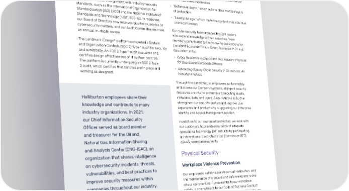 Halliburton 2021 Annual & Sustainability Report Governance 20 Cybersecurity Halliburton subscribes to best-practice design philosophies for IT systems that include “zero trust,” which The frequency and sophistication of global attacks on uses techniques such as: corporate IT systems containing sensitive information • Multi-factor authentication to verify the credentials of have increased. Halliburton takes each threat seriously users’ identities and devices and dedicates significant resources to protect our IT systems and data, in alignment with industry security • “Defense in depth,” which puts in place multiple layers standards, such as the International Organization for of protection Standardization (ISO) 27001 and the National Institute of • “Least privilege,” which limits the content that individual Standards and Technology (NIST) 800-53. In response, users can access our Board of Directors now receives quarterly updates on cybersecurity matters, and our Audit Committee receives Our cybersecurity team includes thought leaders an annual, in-depth review. who expand knowledge of their expertise. Team members contributed to the following publications for The Landmark iEnergy® platform completed a System the World Economic Forum Cyber Resilience in Oil and and Organization Controls (SOC 2) Type 1 audit for security Gas community: and availability. An SOC 2 Type 1 audit evaluates and • Cyber Resilience in the Oil and Gas Industry: Playbook certifies design effectiveness of IT system controls. for Boards and Corporate Officers The platform is currently undergoing an SOC 2 Type 2 audit, which certifies that controls are in place and • Advancing Supply Chain Security in Oil and Gas: An working as designed. Industry Analysis Through the pandemic, as employees work remotely and access our Company systems, stringent security measures are vital to protect our computing assets, Halliburton employees share their networks, data, and users. A key initiative to further knowledge and contribute to many strengthen our security posture and improve user experience and productivity is upgrading our Enterprise industry organizations. In 2021, Identity and Access Management solution. our Chief Information Security In addition to our own asset protection, we work with Officer served as board member our customers to provide assurance of adequate and treasurer for the Oil and operational technology (OT) security by participating in International Electrotechnical Commission (IEC) Natural Gas Information Sharing 62443-based assessments. and Analysis Center (ONG-ISAC), an organization that shares intelligence Physical Security on cybersecurity incidents, threats, Workplace Violence Prevention vulnerabilities, and best practices to improve security measures within Our employees’ safety is paramount at Halliburton, and the maintenance of a secure and safe workplace is one companies throughout our industry. of our key priorities. Fundamental to our workplace safety is commitment to our Code of Business Conduct (COBC) and established security controls. Additionally, we regularly communicate with employees and managers on how to recognize, report, and manage threats of violence. In 2021, our Corporate Security team developed and delivered targeted training modules for key staff members to enhance our ability to respond to threats of violence. We recognize that early identification and pragmatic management of these incidents are crucial factors to reduce and mitigate the risk of violence occurring in the workplace.