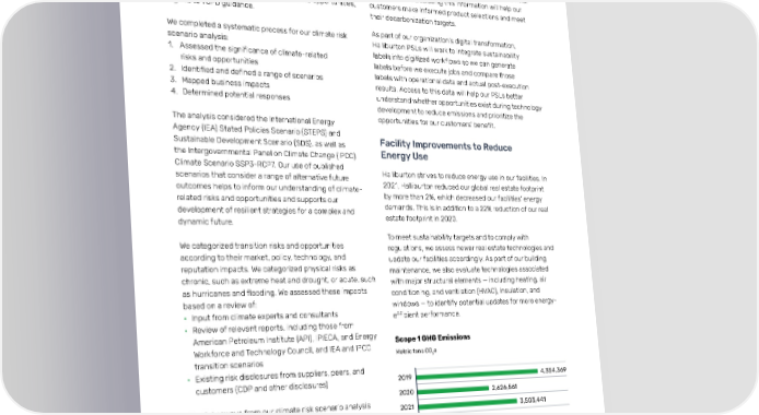 Halliburton 2021 Annual & Sustainability Report Environmental 28 Climate Risk Scenario Analysis Sustainability Labels In 2021, Halliburton conducted a detailed climate risk Using sustainability labels, we identify the emissions scenario analysis. A team of 24 internal cross-functional footprint of our critical products and services in the field. stakeholders, along with external consultants, assessed We expect that disclosing this information will help our the significance of climate-related risks and opportunities, customers make informed product selections and meet aligned to TCFD guidance. their decarbonization targets. We completed a systematic process for our climate risk As part of our organization’s digital transformation, scenario analysis: Halliburton PSLs will work to integrate sustainability 1. Assessed the significance of climate-related labels into digitized workflows so we can generate risks and opportunities labels before we execute jobs and compare those 2. Identified and defined a range of scenarios labels with operational data and actual post-execution 3. Mapped business impacts results. Access to this data will help our PSLs better 4. Determined potential responses understand whether opportunities exist during technology development to reduce emissions and prioritize the The analysis considered the International Energy opportunities for our customers’ benefit. Agency (IEA) Stated Policies Scenario (STEPS) and Facility Improvements to Reduce Sustainable Development Scenario (SDS), as well as the Intergovernmental Panel on Climate Change (IPCC) Energy Use Climate Scenario SSP3-RCP7. Our use of published Halliburton strives to reduce energy use in our facilities. In scenarios that consider a range of alternative future 2021, Halliburton reduced our global real estate footprint outcomes helps to inform our understanding of climate- by more than 2%, which decreased our facilities’ energy related risks and opportunities and supports our demands. This is in addition to a 22% reduction of our real development of resilient strategies for a complex and estate footprint in 2020. dynamic future. To meet sustainability targets and to comply with We categorized transition risks and opportunities regulations, we assess newer real estate technologies and according to their market, policy, technology, and update our facilities accordingly. As part of our building reputation impacts. We categorized physical risks as maintenance, we also evaluate technologies associated chronic, such as extreme heat and drought, or acute, such with major structural elements — including heating, air as hurricanes and flooding. We assessed these impacts conditioning, and ventilation (HVAC), insulation, and based on a review of: windows — to identify potential updates for more energy- • Input from climate experts and consultants efficient performance. • Review of relevant reports, including those from American Petroleum Institute (API), IPIECA, and Energy Scope 1 GHG Emissions Workforce and Technology Council, and IEA and IPCC Metric tons CO e transition scenarios 2 • Existing risk disclosures from suppliers, peers, and customers (CDP and other disclosures) 2019 4,354,369 2020 2,626,561 The takeaways from our climate risk scenario analysis 2021 3,503,441 support our ERM process and reinforce our sustainable energy strategic priorities: Scope 2 GHG Emissions 1 Help our customers meet their goals for Metric tons CO2e reducing GHG emissions 2 Reduce our internal emissions in alignment 2019 249,259 with our science-based targets 2020 191,451 3 Advance clean energy solutions through 2021 248,949 Halliburton Labs