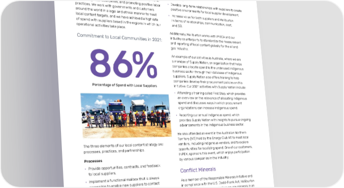Halliburton 2021 Annual & Sustainability Report Governance 24 Local Content • Create a supply chain culture based on our continuous commitment to improvement. Strong, established relationships with local suppliers • Deliver supplier workshops, meetings, and visits. provide Halliburton with strategic and competitive advantages for our operations while expanding the Partnerships capacity and competency of national and local suppliers, • Develop long-term relationships with suppliers to create stimulating local economies, and promoting positive labor positive environments for local supplier development. practices. We work with governments and customers around the world in a legal and ethical manner to meet • Increase value for both suppliers and Halliburton local content targets, and we have achieved a high rate in terms of relationships, communication, cost, of spend with suppliers based in the regions in which our and SQ. operational activities take place. Additionally, Halliburton works with IPIECA and our Commitment to Local Communities in 2021: industry counterparts to standardize the measurement and reporting of local content globally for the oil and gas industry. An example of our activities is Australia, where we are a member of Supply Nation, an organization that helps companies allocate spend to the underused indigenous business sector through their database of indigenous 86% suppliers. Supply Nation also offers training to help companies develop their procurement policies on this Percentage of Spend with Local Suppliers initiative. Our 2021 activities with Supply Nation include: • Attending a training called First Step, which provides an overview on the relevance of allocating indigenous spend and discusses ways in which procurement organizations can increase indigenous spend. • Reporting our annual indigenous spend, which provides Supply Nation with insights to pursue ongoing advancements in the indigenous business sector. We also attended an event in the Australian Northern Territory (NT) held by the Energy Club NT to meet local The three elements of our local content strategy are: vendors, including indigenous vendors, and to explore processes, practices, and partnerships. opportunities for localizing spend. One of our customers, INPEX, sponsors this event, which enjoys participation Processes by various companies in the industry. • Provide opportunities, contracts, and feedback to local suppliers. Conflict Minerals • Implement a functional mailbox that is always accessible to enable new suppliers to contact As a member of the Responsible Minerals Initiative and and present their capabilities to the local in compliance with the U.S. Dodd-Frank Act, Halliburton procurement team. seeks to ensure that our suppliers source minerals in an ethical manner. In 2021, we identified 3,557 suppliers • Visit vendor facilities every month to meet new as subject to the Dodd-Frank Act and contacted them suppliers and develop relationships with as part of our Conflict Minerals campaign. We terminate existing suppliers. relationships with any suppliers who do not cooperate with Dodd-Frank compliance requirements. Practices • Clearly define Halliburton expectations and requirements for HSE and SQ.