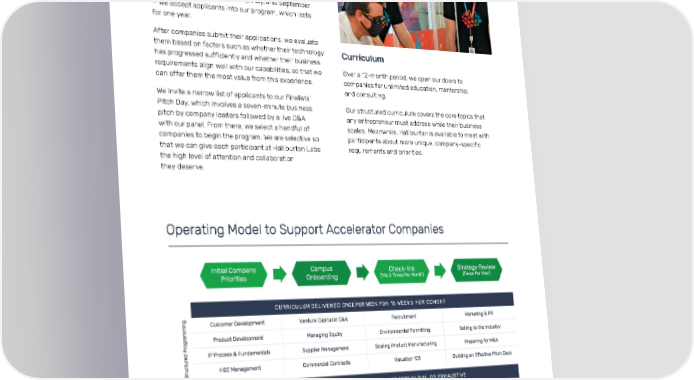 Halliburton 2021 Annual & Sustainability Report Environmental 47 Application Process Halliburton Labs is an open, non-exclusive program. The application to participate is always available on our website. Three times per year — January, May, and September — we accept applicants into our program, which lasts for one year. After companies submit their applications, we evaluate them based on factors such as whether their technology Curriculum has progressed sufficiently and whether their business requirements align well with our capabilities, so that we Over a 12-month period, we open our doors to can offer them the most value from this experience. companies for unlimited education, mentorship, and consulting. We invite a narrow list of applicants to our Finalists’ Pitch Day, which involves a seven-minute business Our structured curriculum covers the core topics that pitch by company leaders followed by a live Q&A any entrepreneur must address while their business with our panel. From there, we select a handful of scales. Meanwhile, Halliburton is available to meet with companies to begin the program. We are selective so participants about more unique, company-specific that we can give each participant at Halliburton Labs requirements and priorities. the high level of attention and collaboration they deserve.
