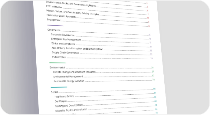 Halliburton 2021 Annual & Sustainability Report Introduction 3 TABLE OF CONTENTS Company at a Glance .......................................................................................................................................................................4 Financial Highlights ..........................................................................................................................................................................5 Environmental, Social, and Governance Highlights ................................................................................................................6 2021 in Review ................................................................................................................................................................................... 7 Mission, Values, and Sustainability Guiding Principles .........................................................................................................10 Materiality-Based Approach .........................................................................................................................................................11 Engagement ..................................................................................................................................................................................... 13 Governance ...................................................................................................................................................................................... 15 Corporate Governance ............................................................................................................................................................ 16 Enterprise Risk Management ................................................................................................................................................. 19 Ethics and Compliance ............................................................................................................................................................ 21 Anti-Bribery, Anti-Corruption, and Fair Competition ......................................................................................................22 Supply Chain Governance ......................................................................................................................................................23 Public Policy ...............................................................................................................................................................................25 Environmental ..................................................................................................................................................................................26 Climate Change and Emissions Reduction ........................................................................................................................27 Environmental Management ................................................................................................................................................. 30 Sustainable Energy Evolution ............................................................................................................................................... 36 Social ................................................................................................................................................................................................. 50 Health and Safety ..................................................................................................................................................................... 51 Our People .................................................................................................................................................................................. 56 Training and Development ..................................................................................................................................................... 60 Diversity, Equity, and Inclusion ..............................................................................................................................................62 Local Communities .................................................................................................................................................................. 66 Human Rights .............................................................................................................................................................................72 Appendix ...........................................................................................................................................................................................74 Data Tables ..................................................................................................................................................................................75 Awards and Recognitions ...................................................................................................................................................... 86 About the Report .......................................................................................................................................................................87