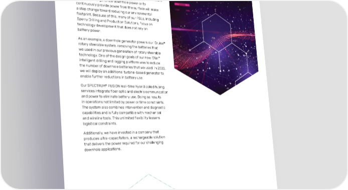 Halliburton 2021 Annual & Sustainability Report Environmental 41 Reduction in Battery Use To improve the sustainability of operations, Halliburton aims to eliminate the use of lithium batteries in our downhole tools. Batteries require complex logistics and safety precautions, as well as recycling. The development of solutions to generate downhole power or to continuously provide power from the surface will make a step change toward reducing our environmental footprint. Because of this, many of our PSLs, including Sperry Drilling and Production Solutions, focus on technology development that does not rely on battery power. As an example, a downhole generator powers our iCruise® rotary steerable system, removing the batteries that we used in our previous generation of rotary steerable technology. One of the design goals of our new iStar™ intelligent drilling and logging platform was to reduce the number of downhole batteries that we used. In 2022, we will deploy an additional turbine-based generator to enable further reductions in battery use. ® Our SPECTRUM FUSION real-time hybrid coiled tubing services integrate fiber optic and electric communication and power to eliminate battery use. Doing so results in operations not limited by power or time constraints. The system also combines intervention and diagnostic capabilities and is fully compatible with mechanical and wireline tools. This unlimited flexibility lessens logistical constraints. Additionally, we have invested in a company that produces ultra-capacitators, a rechargeable solution that delivers the power required for our challenging downhole applications.