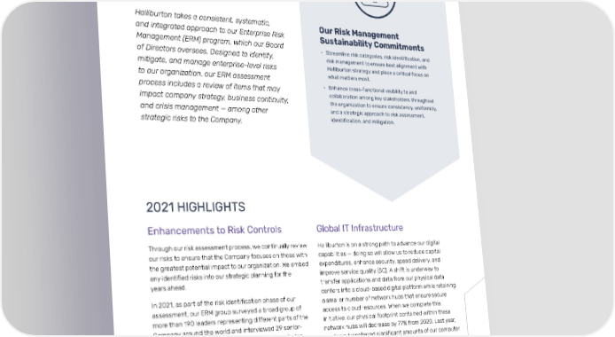 Halliburton 2021 Annual & Sustainability Report Governance 19 G2 Enterprise Risk Management Halliburton takes a consistent, systematic, Our Risk Management and integrated approach to our Enterprise Risk Sustainability Commitments Management (ERM) program, which our Board • Streamline risk categories, risk identification, and of Directors oversees. Designed to identify, risk management to ensure best alignment with mitigate, and manage enterprise-level risks Halliburton strategy and place a critical focus on to our organization, our ERM assessment what matters most. process includes a review of items that may • Enhance cross-functional visibility to and collaboration among key stakeholders throughout impact company strategy, business continuity, the organization to ensure consistency, uniformity, and crisis management — among other and a strategic approach to risk assessment, strategic risks to the Company. identification, and mitigation. 2021 HIGHLIGHTS Enhancements to Risk Controls Global IT Infrastructure Through our risk assessment process, we continually review Halliburton is on a strong path to advance our digital our risks to ensure that the Company focuses on those with capabilities — doing so will allow us to reduce capital the greatest potential impact to our organization. We embed expenditures, enhance security, speed delivery, and any identified risks into our strategic planning for the improve service quality (SQ). A shift is underway to years ahead. transfer applications and data from our physical data centers into a cloud-based digital platform while retaining In 2021, as part of the risk identification phase of our a smaller number of network hubs that ensure secure assessment, our ERM group surveyed a broad group of access to cloud resources. When we complete this more than 190 leaders representing different parts of the initiative, our physical footprint contained within these Company around the world and interviewed 29 senior- network hubs will decrease by 77% from 2020. Last year, level, strategic leaders. We reported the findings to the our team transferred significant amounts of our computer Board of Directors’ Audit Committee, as well as to leaders and storage workload to the cloud and are on target who manage a part of the organization with an to complete all scheduled moves by the third quarter identified risk. of 2022.