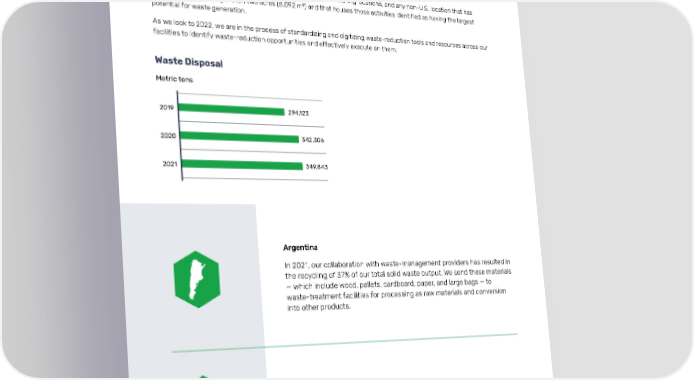 Halliburton 2021 Annual & Sustainability Report Environmental 33 Waste Reduction At Halliburton, we develop waste minimization and management plans to reduce the amount of waste generated at our offices, workshops, field camps, manufacturing facilities, and wellsites under our control. Our waste-generation data covers all U.S. locations, all manufacturing locations, and any non-U.S. location that has a building footprint larger than two acres (8,092 m²) and that houses those activities identified as having the largest potential for waste generation. As we look to 2022, we are in the process of standardizing and digitizing waste-reduction tools and resources across our facilities to identify waste-reduction opportunities and effectively execute on them. Waste Disposal Metric tons 2019 294,123 2020 342,306 2021 349,843 Argentina In 2021, our collaboration with waste-management providers has resulted in the recycling of 37% of our total solid waste output. We send these materials — which include wood, pallets, cardboard, paper, and large bags — to waste-treatment facilities for processing as raw materials and conversion into other products. UK Our waste contractors installed skids that route hard plastic materials for recycling, in addition to softer plastic materials from packaging.