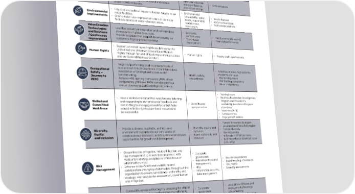 Halliburton 2021 Annual & Sustainability Report Introduction 12 Sustainability Commitments Topics Commitment Material issue Metrics • Achieve a 40% reduction of Scope 1 and 2 emissions • Climate change, GHG Climate by 2035 from 2018 baseline. emission reduction, • GHG emissions Change • Partner with Tier 1 suppliers to track and reduce energy efficiency, Scope 3 GHG emissions. alternative energy • Establish and achieve waste-reduction targets in our • Environmental Environmental major facilities. stewardship: water, • Waste disposal Improvements • Create water-use-improvement plans in our major waste, responsible • Water consumption facilities located in water-stressed areas. resource use, • Spill volume and rate biodiversity Value Creation • Lead the industry in innovation and conscientious • Economic Technologies stewardship of global resources. performance • R&D (patents and spend) and Solutions • Provide solutions that support decarbonizing our • Continuous • Financial performance / Continuous customers’ legacy production base. improvement Improvement • Support universal human rights as defined by the Human Rights United Nations Universal Declaration of Human • Human rights • Supply chain assessments Rights through fair and ethical employment practices and our Code of Business Conduct. • Target outperforming total recordable incident Occupational rate and lost-time incident rate in the International • Fatalities, injuries, high potential Safety — Association of Drilling Contractors sector • Health, safety, incidents and rates Journey to benchmarking. and wellness • HSE training hours ZERO • Achieve HSE training compliance >95%, driver • HSE training compliance competency >95% and 100% completion of our • Driver competency annual Journey to ZERO strategic objectives. • Training hours • Have a skilled and committed workforce by listening • Business Leadership Development Skilled and and responding to our employees’ feedback and Program and President’s Committed committing to an engaged workforce that feels • Benefits and Leadership Excellence Program Workforce valued with the right support and resources to compensation attendees be successful. • New hires (#, %) • Turnover rates • Engagement indices • Female % new hire by region • Provide a diverse, equitable, and inclusive • Diversity, equity, and • Localized workforce % by region Diversity, environment that upholds our core values of inclusion • Female diversity Equity, collaboration and respect, and provides all employees • Board leadership and • Board diversity and Inclusion opportunities for growth and development. inclusion • % female in STEM job roles • % of minorities in STEM job roles (U.S. only) • Streamline risk categories, risk identification, and risk management to ensure best alignment with • Corporate Halliburton strategy and place a critical focus on governance • Board independence Risk what matters most. • Business ethics and • Board meeting attendance Management • Enhance cross-functional visibility to and transparency • Risk matrix collaboration among key stakeholders throughout the • HSE • Security assessments organization to ensure consistency, uniformity, and • Information security, strategic approach to risk assessment, identification, data management and mitigation. • Conduct business with integrity, choosing the ethical • Corporate • Local Ethics Officers and Ethical course of action when confronted with challenging governance engagements/trainings Operations circumstances, promoting a speak-up culture • Business ethics • Ethics training free of retaliation, and treating our employees and and transparency • Code of Business Conduct stakeholders honestly and fairly. (COBC) statistics Supplier • Cultivate a sustainable supply chain through the • Tier 1 count and spend Conduct and continuous improvement of internal processes, • Supply chain • Spend with small and Responsible by performing proactive risk assessments and by sustainability diverse suppliers Procurement working collaboratively with our diverse mix of global • Local region spend % and local suppliers. Community • Enhance the social value of communities in which Relationships we live and work through effective engagement and • Local communities • Charitable giving social investment.