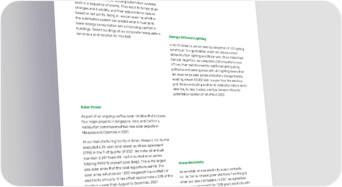 Halliburton 2021 Annual & Sustainability Report Environmental 29 Facility Improvements to Reduce Energy Use (continued) Halliburton evaluates the use of artificial intelligence (AI) to help make our building automation systems for air conditioning and heating proactive, rather than reactive, to external forces. Typical building automation systems work in a sequence of events. They react to temperature changes and humidity, and then adjust interior spaces based on set points. Using AI, we can examine whether the automation system can predict what it must do to lower energy consumption while improving comfort in buildings. Select buildings at our corporate headquarters Energy-Efficient Lighting serve as a pilot location for this test. In North America, we are nearing completion of LED lighting retrofits at 13 large facilities, which will reduce carbon emissions from lighting by 63% per year. At our Añelo Field Camp in Argentina, we completed LED renovations in our offices, then met the need for additional lighting along pathways and parking areas with LED lighting towers that are powered by solar panels and battery storage thereby avoiding almost 40,000 kWh in a year from the electrical grid. We are evaluating another 42 Halliburton sites in North America, Europe, Eurasia, and Sub-Saharan Africa for potential completion of retrofits in 2022. Solar Power As part of an ongoing rooftop solar initiative that includes four major projects in Singapore, India, and California, Halliburton commissioned two new solar projects in Malaysia and Colombia in 2021. At our manufacturing facility in Johor, Malaysia, Halliburton executed a 25-year solar power purchase agreement (PPA) in the first quarter of 2021. We installed and will maintain 2,247 fixed-tilt, roof-mounted solar panels totaling 999,915 kilowatt peak (kWp). This is the largest size solar array that the local regulations permit. The Green Electricity solar array will produce 1,000 megawatt hours (MWh) of As we establish new electricity supply contracts, electricity annually. It has offset approximately 22% of the Halliburton purchases green electricity from the grid facility’s usage from August to December, 2021. when available and feasible. In 2021, we signed two Additionally, at our field camp in Barrancabermeja, three-year agreements for 100% green electricity with Colombia, Halliburton executed a 10-year solar PPA in 12 accounts in Alberta, Canada, and two accounts in the fourth quarter of 2021. We installed and will maintain Pennsylvania in the U.S. 278 fixed-tilt, roof-mounted solar panels totaling 99 kWp. The solar array will produce 228,000 kWh of electricity annually, offsetting approximately 49% of the facility’s current usage. In 2022, we expect to explore similar projects elsewhere in Colombia, as well as in Mexico and Brazil.