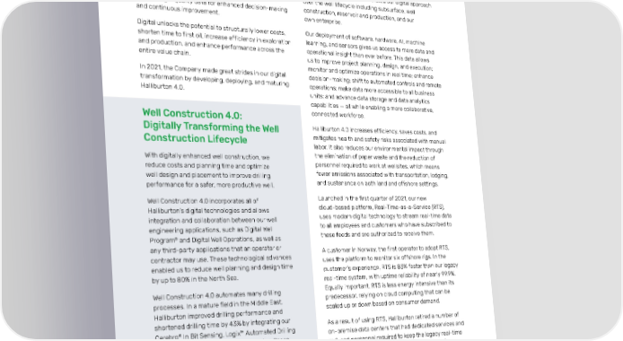 Halliburton 2021 Annual & Sustainability Report Environmental 43 Digital Transformation Halliburton deploys digital technology across all Halliburton 4.0 business lines and geographies to improve efficiencies and outcomes. Many of these capabilities reduce GHG In 2021, Halliburton 4.0 accelerated our digital approach emissions through optimization and efficiencies and over the well lifecycle including subsurface, well provide high-quality data for enhanced decision-making construction, reservoir and production, and our and continuous improvement. own enterprise. Digital unlocks the potential to structurally lower costs, Our deployment of software, hardware, AI, machine shorten time to first oil, increase efficiency in exploration learning, and sensors gives us access to more data and and production, and enhance performance across the operational insight than ever before. This data allows entire value chain. us to improve project planning, design, and execution; monitor and optimize operations in real time; enhance In 2021, the Company made great strides in our digital decision-making; shift to automated controls and remote transformation by developing, deploying, and maturing operations; make data more accessible to all business Halliburton 4.0. units; and advance data storage and data analytics capabilities — all while enabling a more collaborative, Well Construction 4.0: connected workforce. Digitally Transforming the Well Halliburton 4.0 increases efficiency, saves costs, and Construction Lifecycle mitigates health and safety risks associated with manual labor. It also reduces our environmental impact through With digitally enhanced well construction, we the elimination of paper waste and the reduction of reduce costs and planning time and optimize personnel required to work at wellsites, which means well design and placement to improve drilling fewer emissions associated with transportation, lodging, performance for a safer, more productive well. and sustenance on both land and offshore settings. Well Construction 4.0 incorporates all of Launched in the first quarter of 2021, our new Halliburton’s digital technologies and allows cloud-based platform, Real-Time-as-a-Service (RTS), integration and collaboration between our well uses modern digital technology to stream real-time data engineering applications, such as Digital Well to all employees and customers who have subscribed to ® these feeds and are authorized to receive them. Program and Digital Well Operations, as well as any third-party applications that an operator or A customer in Norway, the first operator to adopt RTS, contractor may use. These technological advances uses the platform to monitor six offshore rigs. In the enabled us to reduce well planning and design time customer’s experience, RTS is 83% faster than our legacy by up to 80% in the North Sea. real-time system, with uptime reliability of nearly 99.9%. Well Construction 4.0 automates many drilling Equally important, RTS is less energy intensive than its processes. In a mature field in the Middle East, predecessor, relying on cloud computing that can be Halliburton improved drilling performance and scaled up or down based on consumer demand. shortened drilling time by 43% by integrating our As a result of using RTS, Halliburton retired a number of Cerebro® In Bit Sensing, Logix™ Automated Drilling Solution, N-Flow™ 325 filter cake breaker, Pason on-premise data centers that had dedicated services and AutoDriller, and project management services. reduced personnel required to keep the legacy real-time system functional. Our goal is to convert 100% of our Additionally, with our remote operations, Well real-time requirements to the RTS platform in the first Construction 4.0 helps reduce the number of half of 2022. people required on-site. For the first two sections For more information about Halliburton 4.0, of a job at an offshore rig in Southeast Asia, please visit the Halliburton 4.0 page on our website. Halliburton decreased the number of people at the wellsite by 21%, which also reduced helicopter rides and international commercial flights to the rig.