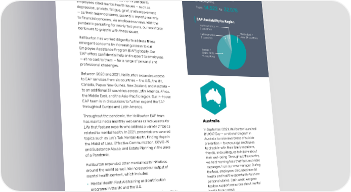 Halliburton 2021 Annual & Sustainability Report Social 58 Prioritization of Mental Health Over the last two years, the public health crisis caused by the COVID-19 pandemic has created and exacerbated Increase in Access (by Number many hardships for millions of people around the world. of Employees), During the first year of the COVID-19 pandemic, From to employees cited mental health issues — such as depression, anxiety, fatigue, grief, and bereavement — as their major concerns, second in importance only to financial concerns, via employee surveys. With the North America: 2 countries pandemic persisting for nearly two years, our workforce Middle East / continues to grapple with these issues. Latin America: Asia: 24 countries 2 countries Halliburton has worked diligently to address these emergent concerns by increasing access to our Europe / Employee Assistance Program (EAP) globally. Our Africa / CIS: 15 countries EAP offers confidential help and support to employees — at no cost to them — for a range of personal and professional challenges. Between 2020 and 2021, Halliburton expanded access to EAP services from six countries — the U.S., the UK, Canada, Papua New Guinea, New Zealand, and Australia — to an additional 37 countries across Latin America, Africa, the Middle East, and the Asia-Pacific region. Our in-house EAP team is in discussions to further expand the EAP throughout Europe and Latin America. Throughout the pandemic, the Halliburton EAP team has maintained a monthly web series called Lessons for Australia Life that feature experts who address a variety of topics related to mental health. In 2021, presentations covered In September 2021, Halliburton launched topics such as Let’s Talk Mental Health, Finding Hope in R U OK? Day — a national program in the Midst of Loss, Effective Communication, COVID-19 Australia to raise awareness of suicide and Substance Abuse, and Estate Planning in the Wake prevention — to encourage employees of a Pandemic. to check in with their family members, friends, and colleagues to inquire about Halliburton expanded other mental health initiatives their well-being. Throughout the country, around the world as well. We increased our output of we held morning teas that featured video mental health content, which includes: messages from our area manager. During the teas, employees discussed mental • Mental Health First Aid training and certification health and had the opportunity to share programs in the UK and the U.S. personal stories. Each week, we gave • Quarterly EAP newsletters that we distribute in multiple toolbox support resources about mental health to our crews. markets to raise mental health awareness and engagement globally Additionally, we organized weekly Zoom • Global mental health campaign for World Mental webinars on mental health awareness Health Day in which we delivered consistent that were led by health professionals, and we created a Yammer page to create messaging globally to all employees to raise a sense of community across this region, mental health awareness in which we regularly share mental health tools and resources. We also introduced mental-health first aiders in our Australia locations.
