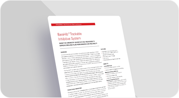 OVERVIEW In environmentally sensitive areas, high-performance water base fluids (HPWBF) are suitable alternatives to non-aqueous drilling fluids (NAF). HPWBF rely on shale inhibitors – amine inhibitors and polymeric encapsulators – to achieve drilling fluids performance similar to NA F. T raditionally amine inhibitors have been tracked through mass balance calculations. These inhibitors can deplete faster than indicated by calculations during drilling operations . This can lead to issues such as wellbore instability, stuck pipe incidents, non-productive time (NPT), loss of reservoir access and increased well costs for operators. The BaraHib™ trackable highly-inhibitive system (TIS) is a high-performance water - based fluid which uses advanced inhibitive chemistry that can be quantitatively measured continuously at the rigsite. This unique capability helps operators improve operational reliability and reduce environmental impact, maximizing asset value. In addition, BaraHib TIS provides excellent wellbore stability in various types of clay mineralogy, improved lubricity, and maximum hole cleaning in highly- deviated and long lateral wellbore sections. The inhibition framework can be customized to avoid shale swelling, prevent cuttings dispersion through shale encapsulation, and reduce bit-balling tendencies with anti-accretion coating. TRACK SHALE INHIBITORS Formations that contain hydratable shale or mixed layers of reactive clay can lead to wellbore instability issues. The BaraHib TIS tracks shale inhibitor concentration through quantitative measurements instead of the volumetric tracking approach commonly used in the industry. This innovative tracking method accurately measures amine-based inhibitors. As a result, operators can achieve effective shale inhibition improving wellbore stability, maximizing drilling efficiency, and enhancing control over the wellbore. IMPROVE OPERATIONAL RELIABILITY The BaraHib TIS is engineered to suppress reactive clay hydration, allowing operators to drill longer hole sections and eliminate the need to back ream due to clay swelling. Shear thinning behavior enhances hydraulic horsepower and improves hole cleaning and suspension, maximizing ROP. BaraHib ™ Trackable Inhibitive System IN HIBITIVE CHEMISTRY QUANTI TATIVELY MEA SURED TO IMPR OVE DRILLING FLUID PERFORMANCE AND RELIABILIT Y FEATURES » Quantitative trackable amine inhibitor » Thermally stable to 300 ° F (149 ° C) with standard component range » Fluid weight up to 17.5 lb/gal » Low toxicity » Environmental Gold Rated for North Sea BENEFITS Lower Well Costs LEVEL 1 CAPABILITY | Level 2 Capability (if applicable) Drilling Fluids | High-Performance Water-based Systems » Effective inhibitor depletion tracking » Improve stability for logging and cementing Maximize Drilling Efficiency » Inhibition of reactive shale formations » Minimize colloidal solids » Optimized rheology for hole cleaning Customizable Fluid System » Engineered for speed, stability, and simplicity » Inhibitor s matched to various formation types » Nano particle sized bridging polymers seal micro-fractures, strengthen the wellbore and improve stability
