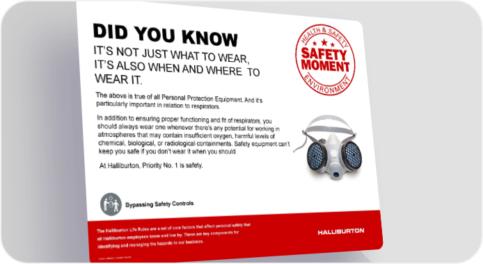 8 © 2016 Halliburton. All rights reserved. © 2014 Halliburton. All rights reserved. The Halliburton Life Rules are a set of core factors that affect personal safety that all Halliburton employees know and live by. These are key components for identifying and managing the hazards in our business. IT’S NOT JUST WHAT TO WEAR, IT’S ALSO WHEN AND WHERE TO WEAR IT. DID YOU KNOW The above is true of all Personal Protection Equipment. And it’s particularly important in relation to respirators. In addition to ensuring proper functioning and fit of respirators, you should always wear one whenever there’s any potential for working in atmospheres that may contain insufficient oxygen, harmful levels of chemical, biological, or radiological containments. Safety equipment can’t keep you safe if you don’t wear it when you should. At Halliburton, Priority No. 1 is safety. Bypassing Safety Controls