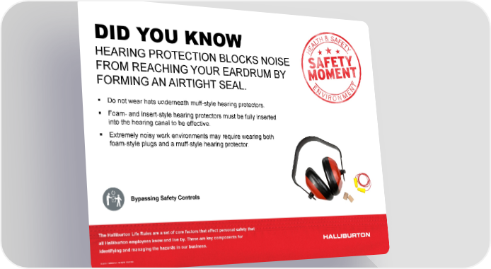 © 2014 Halliburton. All rights reserved. DID YOU KNOW HEARING PROTECTION BLOCKS NOISE FROM REACHING YOUR EARDRUM BY FORMING AN AIRTIGHT SEAL. Do not wear hats underneath muff -style hearing protectors. Foam - and insert -style hearing protectors must be fully inserted into the hearing canal to be effective. Extremely noisy work environments may require wearing both foam -style plugs and a muff -style hearing protector. Bypassing Safety Controls The Halliburton Life Rules are a set of core factors that affect personal safety that all Halliburton employees know and live by. These are key components for identifying and managing the hazards in our business.