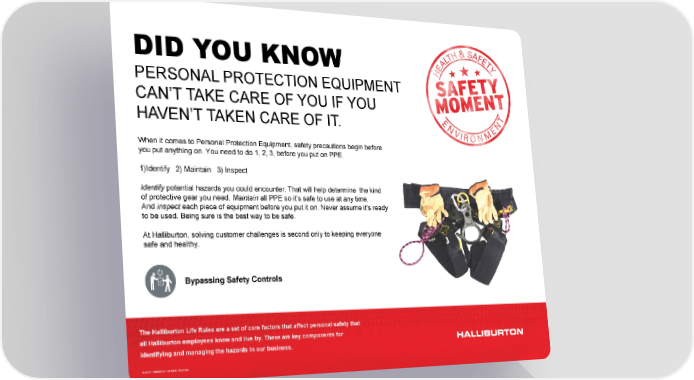 © 2014 Halliburton. All rights reserved. DID YOU KNOW PERSONAL PROTECTION EQUIPMENT CAN’T TAKE CARE OF YOU IF YOU HAVEN’T TAKEN CARE OF IT. When it comes to Personal Protection Equipment, safety precautions begin before you put anything on. You need to do 1, 2, 3, before you put on PPE. 1)Identify 2) Maintain 3) Inspect Identify potential hazards you could encounter. That will help determine the kind of protective gear you need. Maintain all PPE so it’s safe to use at any time. And inspect each piece of equipment before you put it on. Never assume it’s ready to be used. Being sure is the best way to be safe. At Halliburton, solving customer challenges is second only to keeping everyone safe and healthy. Bypassing Safety Controls The Halliburton Life Rules are a set of core factors that affect personal safety that all Halliburton employees know and live by. These are key components for identifying and managing the hazards in our business.
