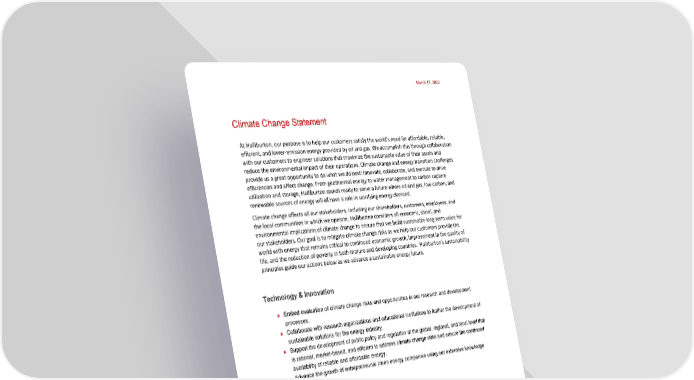 March 17, 2022 halliburton.com © 202 2 Halliburton All Rights Reserved. 1 Climate Change Statement At Halliburton, our purpose is to help our customers satisfy the world’s need for affordable, reliable, efficient, and lower -emission energy provided by oil and gas. We accomplish this through collaboration with our customers to engineer solutions that maximize the sustainable value of their assets and reduce the environmental impact of their operations. Climate change and energy transition challenges provide us a great opportunity to do what we do best: innovate, collaborate, and execute to drive efficiencies and affect change. From geothermal energy to water management to carbon capture utilization and storage, Halliburton stands ready to serve a future where oil and gas, low -carbon, and renewa ble sources of energy will all have a role in satisfying energy demand. Climate change affects all our stakeholders, including our shareholders, customers, employees, and the local communities in which we operate. Halliburton considers all economic, socia l, and environmental implications of climate change to ensure that we build sustainable long -term value for our stakeholders. Our goal is to mitigate climate change risks as we help our customers provide the world with energy that remains critical to conti nued economic growth, improvement in the quality of life, and the reduction of poverty in both mature and developing countries. Halliburton’s sustainability principles guide our actions below as we advance a sustainable energy future. Technology & Innovation » Embed evaluation of climate change risks and opportunities in our research and development processes. » Collaborate with research organizations and educational institutions to further the development of sustainable solutions for the energy industry. » Support the development of public policy and regulation at the global, regional, and local level that is rational, market -based, and efficient to address climate change risks and ensure the continued availability of reliable and affordable energy. » Advanc e the growth of entrepreneurial clean energy companies using our extensive knowledge and experience. Value Chain » Develop products and services that enable our customers to reduce their environmental impacts throughout the life cycle of their assets. » As sist our customers to effectively use our portfolio of products and services to help reduce GHG emissions in their energy development and through carbon capture storage projects. » Work with critical suppliers to reduce the environmental impacts of their operations and to track and reduce the GHG emissions of their products.