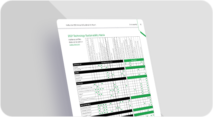 Halliburton 2021 Annual & Sustainability Report Environmental 42 2021 Technology Sustainability Matrix Additional portfolio e s d t G e e i y l s d t c items can be seen on - GH n uc e l li y e n o d i c f i e b e i s d s ro uc u f l l e o ns/ e l u a l Halliburton.com. l o u r p d l f r r e ng p i c f t e s i o d o i o s u n t ro e s dur / w d s s d m i s c s r d n f n e t i o r l a p r o e n a n m r a e t e o t f p e d ua w t ou f f h ial g s e r p r he d s s s r e at a n r o id e e i u a s s d o hig e s c i er e c v v t y t u y n i s o us / s w g a / u t o s b n t d o s r do c n a e i i nd i i e u t r s e d r t d m y g s o al quir do a u a t a m o g i u l u e en s o rr r e u t f d c o n d e os i n e / r u r i r / do mp ener sp e t oi / r d a m t e haz r i y i l y te p n p v e f af i e - a fe c t r r b t z e in s rem n t i h l i e e i i ble i l l er u o s a s s a a h r s n az o li y i e t r o p k u i a c r c b e t s c t t i f t t a f j t l u u no a q no h a w r e e e fo e y f w f hs/ o : e f f t t g r s at o re ns t o e l re r c n r s w b s n o ial u i f r o o o e e e s e n m o o c e o e oial / l o ns s a i t i l f i r nc o ng p l i a v e v t n s i m m e e a s i me me rene a o l o s i a e s s u c s l t s s e a t e r p r b r k r i ctr u l t a i l a u u s n r r t s e l a i l l ans e e a c l o p p o u o o l o o p u o o o r s s o n l m na m D P Em F E V V m S N Sp C V V T U U H C I a I E I W ARTIFICIAL LIFT Reduction or Elimination Improvement GeoESP® Tiger Shark III® BAROID BaraECD® BaraHib™ Gold BaraXcel™ CEMENTING AirGlide™ Asset Light-Remote Control Silos Autonomous Cementing Operations IsoBond™ Obex™ Tuned® Defense™ E Cement Spacer WellLife® COMPLETION TOOLS ® eCompletions™ Clariti ® ® SmartWell eMotion MultiLateral FlexRite® SmartWell® Fuzion™ DRILL BITS & SERVICES Articulating Gauge MULTI-CHEM APX™ — Analyzing Performance eXecution Ferrogone™ FeS Inhibitor FightR™ LX-18 Triple-Combo Inhibitors PRODUCTION ENHANCEMENT Dual Fuel Tier 4 Zeus ™ PRODUCTION SOLUTIONS HalKleen™ SafeGrip™ WaterWeb® TESTING & SUBSEA Single Trip Perf & Surge WIRELINE & PERFORATING RTRAC StrataXaminer™