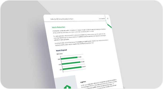 Halliburton 2021 Annual & Sustainability Report Environmental 33 Waste Reduction At Halliburton, we develop waste minimization and management plans to reduce the amount of waste generated at our offices, workshops, field camps, manufacturing facilities, and wellsites under our control. Our waste-generation data covers all U.S. locations, all manufacturing locations, and any non-U.S. location that has a building footprint larger than two acres (8,092 m²) and that houses those activities identified as having the largest potential for waste generation. As we look to 2022, we are in the process of standardizing and digitizing waste-reduction tools and resources across our facilities to identify waste-reduction opportunities and effectively execute on them. Waste Disposal Metric tons 2019 294,123 2020 342,306 2021 349,843 Argentina In 2021, our collaboration with waste-management providers has resulted in the recycling of 37% of our total solid waste output. We send these materials — which include wood, pallets, cardboard, paper, and large bags — to waste-treatment facilities for processing as raw materials and conversion into other products. UK Our waste contractors installed skids that route hard plastic materials for recycling, in addition to softer plastic materials from packaging.
