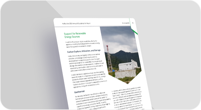 Halliburton 2021 Annual & Sustainability Report Environmental 45 Support for Renewable Energy Sources In addition to using our digital capabilities, Halliburton applies our existing technologies to the renewable energy space for a greater environmental impact. Carbon Capture, Utilization, and Storage Halliburton actively participates in the carbon capture, utilization, and storage (CCUS) industry, and has developed technologies to support carbon transport and storage projects. Our capabilities include geological storage site selection and development, in addition to well repurposing, construction, and monitoring, and pipeline and subsea construction and maintenance. In 2021, Halliburton applied a unique, machine learning- based 3D model for a Japanese company to estimate the availability of pore space over large areas for CO2 storage. This model increased operational efficiency, with a fivefold reduction in time spent compared to conventional approaches, along with increased accuracy. Geothermal For decades, Halliburton has offered our advanced In Indonesia, which is the world’s top geothermal market, technologies and experience to customers developing Halliburton has supported geothermal activity for more complete geothermal solutions around the world. Our than 30 years. In this time, we have drilled and produced products and services address every aspect of developing more than 220 wells, and completed approximately 40 a geothermal energy production facility, including wells with Halliburton Project Management’s Integrated project management, drilling, cementing, fluids, logging, Services. In 2021, Halliburton continued to contribute completions, stimulation, and geofluids transfer. to the Sarulla Geothermal project. For this project, we have worked with a market leader for more than 15 Geothermal energy demand has expanded to more years to provide drilling and cementing services in the shallow-source, lower-heat applications for heating development of this clean, renewable energy source. and cooling. For electricity generation, the geothermal During this time, we helped our customer produce clean market has expanded to deeper, higher-heat sources. electricity from geothermal wells safely, efficiently, and Although these geothermal sources are much more cost-effectively, and enabled a larger number of wells to efficient in generating electricity, they require produce from a single pad for less environmental impact. advanced geothermal systems to overcome technical challenges, and Halliburton is working to service these emerging markets.