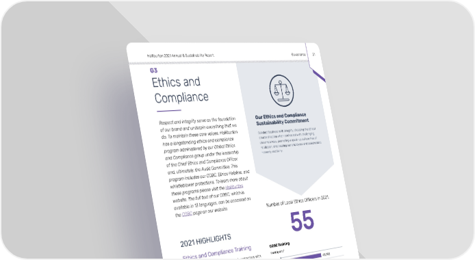 Halliburton 2021 Annual & Sustainability Report Governance 21 G3 Ethics and Compliance Respect and integrity serve as the foundation Our Ethics and Compliance of our brand and underpin everything that we Sustainability Commitment do. To maintain these core values, Halliburton Conduct business with integrity, choosing the ethical has a longstanding ethics and compliance course of action when confronted with challenging program administered by our Global Ethics circumstances, promoting a speak-up culture free of and Compliance group under the leadership retaliation, and treating our employees and stakeholders honestly and fairly. of the Chief Ethics and Compliance Officer and, ultimately, the Audit Committee. This program includes our COBC, Ethics Helpline, and whistleblower protections. To learn more about these programs please visit the Halliburton website. The full text of our COBC, which is available in 13 languages, can be accessed on the COBC page on our website. Number of Local Ethics Officers in 2021: 2021 HIGHLIGHTS 55 Ethics and Compliance Training COBC Training Halliburton requires all employees and contractors with Participants* access to our systems to complete in-person or online COBC training every two years. We rely on our Local 2019 43,792 Ethics Officers (LEOs) to supplement this education by maintaining awareness of ethics and compliance issues 2020 45,989 on an ongoing basis and serving as a resource for our 2021 50,634 employees and contractors. We have 55 LEOs in 40 countries who model ethical behavior, answer questions, * Participants include employees, contractors, and consultants who provide guidance, take reports of suspected misconduct, took the training during 2021. and deliver quarterly Ethics Moments and biweekly Ethics Topics. In 2021, LEOs conducted 2,699 presentations. Enhanced Procurement Fraud Training in Countries This year, Halliburton provided relevant, timely, and Designated as High-Risk for Procurement Fraud targeted virtual ethics and compliance training to Participants employees around the globe — and our LEOs played a critical part in this accomplishment. 2019 1,433 2020 1,637 2021 1,703