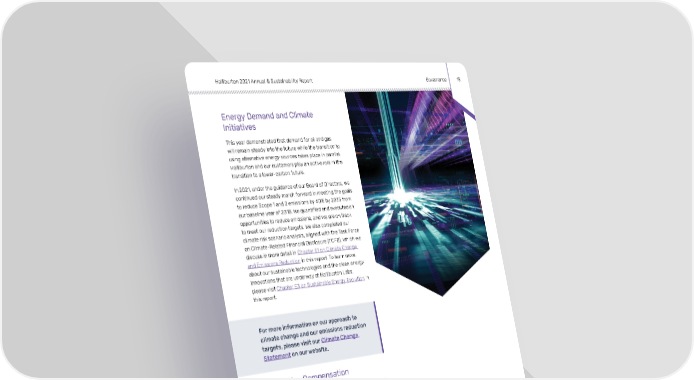 Halliburton 2021 Annual & Sustainability Report Governance 18 Energy Demand and Climate Initiatives This year demonstrated that demand for oil and gas will remain steady into the future while the transition to using alternative energy sources takes place in parallel. Halliburton and our customers play an active role in the transition to a lower-carbon future. In 2021, under the guidance of our Board of Directors, we continued our steady march forward in meeting the goals to reduce Scope 1 and 2 emissions by 40% by 2035 from our baseline year of 2018. We quantified and executed on opportunities to reduce emissions, and we are on track to meet our reduction targets. We also completed our climate risk scenario analysis, aligned with the Task Force on Climate-Related Financial Disclosure (TCFD), which we discuss in more detail in Chapter E1 on Climate Change and Emissions Reduction in this report. To learn more about our sustainable technologies and the clean energy innovations that are underway at Halliburton Labs, please visit Chapter E3 on Sustainable Energy Evolution in this report. For more information on our approach to climate change and our emissions reduction targets, please visit our Climate Change Statement on our website. Executive Compensation We integrate our executive compensation programs within our overall business strategy and management processes to incentivize performance, maximize returns, and build shareholder value. The majority of our total compensation is performance based, at risk, and long term. We combine financial and strategic metrics in our annual incentive plan, and we include relative performance measures in our long-term incentive plan. As a result of our Listen and Respond shareholder outreach effort, and with the endorsement of our shareholders, we amended our annual incentive plan For more detailed background information about to include ESG-related metrics focused on greenhouse the Corporate Governance and our Board of gas (GHG) emissions and DE&I — two of our main areas Directors, including committee structure, roles and responsibilities, and individual member qualifications, of focus. ESG-related metrics will comprise 20% of the please visit the Halliburton website or view our 2022 total award, with achievement of specific financial goals Proxy Statement. comprising 80% of the total award. These changes are effective January 1, 2022.