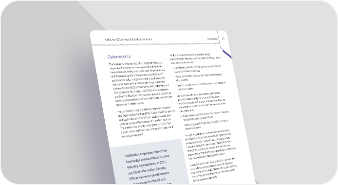 Halliburton 2021 Annual & Sustainability Report Governance 20 Cybersecurity Halliburton subscribes to best-practice design philosophies for IT systems that include “zero trust,” which The frequency and sophistication of global attacks on uses techniques such as: corporate IT systems containing sensitive information • Multi-factor authentication to verify the credentials of have increased. Halliburton takes each threat seriously users’ identities and devices and dedicates significant resources to protect our IT systems and data, in alignment with industry security • “Defense in depth,” which puts in place multiple layers standards, such as the International Organization for of protection Standardization (ISO) 27001 and the National Institute of • “Least privilege,” which limits the content that individual Standards and Technology (NIST) 800-53. In response, users can access our Board of Directors now receives quarterly updates on cybersecurity matters, and our Audit Committee receives Our cybersecurity team includes thought leaders an annual, in-depth review. who expand knowledge of their expertise. Team members contributed to the following publications for The Landmark iEnergy® platform completed a System the World Economic Forum Cyber Resilience in Oil and and Organization Controls (SOC 2) Type 1 audit for security Gas community: and availability. An SOC 2 Type 1 audit evaluates and • Cyber Resilience in the Oil and Gas Industry: Playbook certifies design effectiveness of IT system controls. for Boards and Corporate Officers The platform is currently undergoing an SOC 2 Type 2 audit, which certifies that controls are in place and • Advancing Supply Chain Security in Oil and Gas: An working as designed. Industry Analysis Through the pandemic, as employees work remotely and access our Company systems, stringent security measures are vital to protect our computing assets, Halliburton employees share their networks, data, and users. A key initiative to further knowledge and contribute to many strengthen our security posture and improve user experience and productivity is upgrading our Enterprise industry organizations. In 2021, Identity and Access Management solution. our Chief Information Security In addition to our own asset protection, we work with Officer served as board member our customers to provide assurance of adequate and treasurer for the Oil and operational technology (OT) security by participating in International Electrotechnical Commission (IEC) Natural Gas Information Sharing 62443-based assessments. and Analysis Center (ONG-ISAC), an organization that shares intelligence Physical Security on cybersecurity incidents, threats, Workplace Violence Prevention vulnerabilities, and best practices to improve security measures within Our employees’ safety is paramount at Halliburton, and the maintenance of a secure and safe workplace is one companies throughout our industry. of our key priorities. Fundamental to our workplace safety is commitment to our Code of Business Conduct (COBC) and established security controls. Additionally, we regularly communicate with employees and managers on how to recognize, report, and manage threats of violence. In 2021, our Corporate Security team developed and delivered targeted training modules for key staff members to enhance our ability to respond to threats of violence. We recognize that early identification and pragmatic management of these incidents are crucial factors to reduce and mitigate the risk of violence occurring in the workplace.