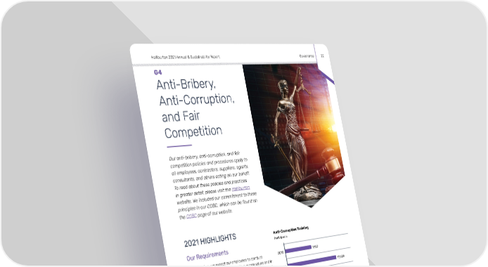 Halliburton 2021 Annual & Sustainability Report Governance 22 G4 Anti-Bribery, Anti-Corruption, and Fair Competition Our anti-bribery, anti-corruption, and fair competition policies and procedures apply to all employees, contractors, suppliers, agents, consultants, and others acting on our behalf. To read about these policies and practices in greater detail, please visit the Halliburton website. We included our commitment to these principles in our COBC, which can be found on the COBC page of our website. 2021 HIGHLIGHTS Anti-Corruption Training Participants Our Requirements At Halliburton, we expect our employees to conduct 2019 9,187 business in a manner that aligns with our core values and in compliance with laws that include the U.S. Foreign Corrupt 2020 17,409 Practices Act (FCPA), the UK Bribery Act 2010, and similar applicable laws around the world. Additionally, we expect our people to compete fairly and to win business in a legal 2021 18,170 and ethical manner, which includes refraining from making unfair or disparaging comments about our competitors and their offerings. Employee Training All employees with relevant job functions and those management and due diligence and provides guidance on working in high-risk countries complete anti-bribery and ethical conduct when providing business hospitality and anti-corruption training. This training emphasizes charitable contributions. In 2021, because of the ongoing Halliburton’s core commitment to conducting business COVID-19 pandemic, the Global Ethics and Compliance the REDWay (Responsibly, Ethically, and Diligently) in all group conducted virtual training sessions to supplement that we do. It highlights international business relationship our web-based anti-corruption training courses.