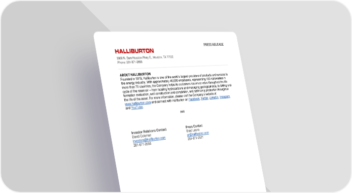 PRESS RELEASE 3000 N. Sam Houston Pkwy E., Houston, TX 77032 Phone: 281-871-2699 ABOUT HALLIBURTON Founded in 1919, Halliburton is one of the world’s largest providers of products and services to the energy industry. With approximately 45,000 employees, representing 130 nationalities in more than 70 countries, the Company helps its customers maximize value throughout the life cycle of the reservoir – from locating hydrocarbons and managing geological data, to drilling and formation evaluation, well construction and completion, and optimizing production throughout the life of the asset. For more information, please visit the Company’s website at www.halliburton.com and connect with Halliburton on Facebook, Twitter, LinkedIn, Instagram and YouTube. ### Investor Relations Contact Press Contact David Coleman Brad Leone [email protected] [email protected] 281-871-2688 281-871-2601 Page 2 of 2