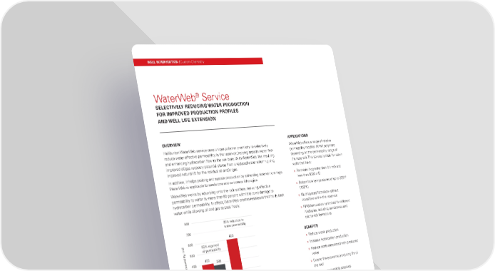 APPLICATIONS WaterWeb offers a range of relative permeability modifier (RPM) polymers depending on the permeability range of the reservoir. This service is ideal for use in wells that have: » Permeability greater than 0.1 mD and less than 8000 mD » Bottomhole temperatures of up to 325°F (163°C) » Multi-layered formation without crossflow within the reservoir » RPM formulation optimized for different lithologies, including sandstones and calcite-rich formations BENEFITS » Reduce water production » Increase hydrocarbon production » Reduce costs associated with produced water » Extend the economic producing life of the well » Increase recoverable reserves OVERVIEW Halliburton WaterWeb service uses unique polymer chemistry to selectively reduce water effective permeability in the reservoir, helping impede water flow and enhancing hydrocarbon flow to the wellbore. With WaterWeb, the resulting improved oil/gas recovery potential stems from a reduced water column giving improved natural lift for the residual oil and/or gas. In addition, it helps prolong and sustain production by enhancing reservoir drainage. WaterWeb is applicable to sandstone and carbonate lithologies. WaterWeb works by adsorbing onto the rock surface, reducing effective permeability to water by more than 90 percent with little to no damage to hydrocarbon permeability. In effect, WaterWeb creates resistance that holds back water while allowing oil and gas to pass freely. WaterWeb ® Service SELECTIVELY REDUCING WATER PRODUCTION FOR IMPROVED PRODUCTION PROFILES AND WELL LIFE EXTENSION WaterWeb polymer adsorbs to the rock surface, selectively decreasing effective water permeability with little to no damage to hydrocarbon flow. The above graph shows the response of an oil saturated core and a water saturated core before and after treatment with WaterWeb service. In this case, the effective permeability of the water saturated core was significantly decreased while the effective permeability in the oil saturated core was minimally impacted. Both permeabilities were measured at residual oil and water saturations, respectively. LEVEL 1 CAPABILITY | Level 2 Capability (if applicable) WELL INTERVENTION | Custom Chemistry