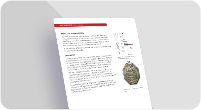 Figure A - wellbore schematic and PLT before WaterWeb service treatment. EASY TO USE AND FIELD PROVEN WaterWeb service requires no special placement techniques. It is unaffected by multivalent cations, oxygen, or acids. It does not require rig time or zonal isolation. WaterWeb service works by immediately adsorbing to the rock matrix as it is being pumped (it does not gel or “set up”), so the wellbore can immediately be brought back to production after the treatment. No shut-in time is required. To date, Halliburton RPM chemistry has been used in more than 3,000 wells around the world with excellent results. CASE HISTROY A cased-hole and perforated well producing from an onshore laminated sandstone oil reservoirwas completed in 15 different zones (681 ft gross interval, 155 ft of net perforations) with the following properties: 20°API oil, average permeability ~195- md, average porosity ~13 percent, and BHT~280°F. Water production had been a major challenge in this reservoir, limiting the economic life of many wellbores. Production rates for the well before WaterWeb service were reported as 1200-BFPD, 260-BOPD, 960-BWPD, and 80 percent water cut. Figure A shows the wellbore schematic and the results of a production logging tool (PLT) run performed before the RPM treatment. Although the PLT clearly identified the intervals contributing to most of the water production, the same intervals were also producing a significant amount of oil. The treatment consisted of pumping 180-bbl of WaterWeb service. After the treatment, the well began producing at 2400-BFPD, 1560-BOPD, 840-BWPD, and 35 percent water cut. Production had stabilized to 850-BFPD, 510-BOPD, 340- BWPD, and 60 percent water cut. Winner – Hart’s Meritorious Engineering Innovation Award LEVEL 1 CAPABILITY | Level 2 Capability (if applicable) WELL INTERVENTION | Custom Chemistry For more information, contact your local Halliburton representative or visit us on the web at www.halliburton.com Sales of Halliburton products and services will be in accord solely with the terms and conditions contained in the contract between Halliburton and the customer that is applicable to the sale. H03706 03/21 © 2021 Halliburton. All Rights Reserved.